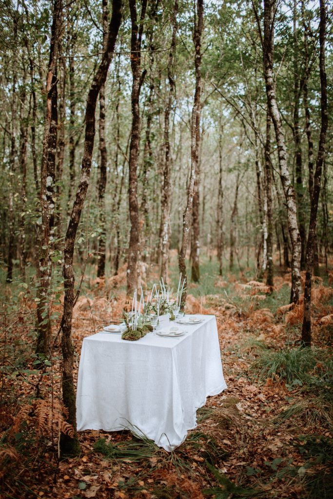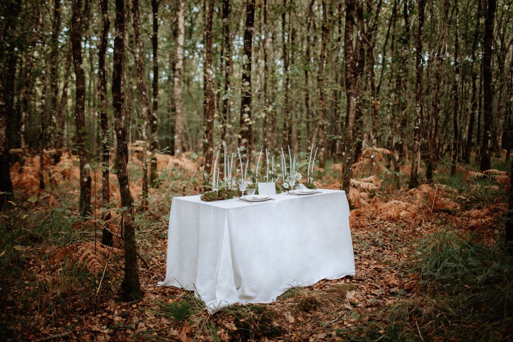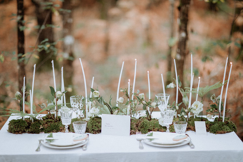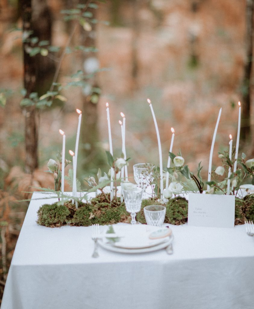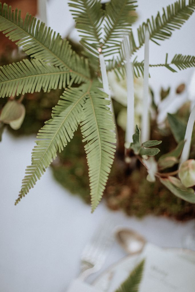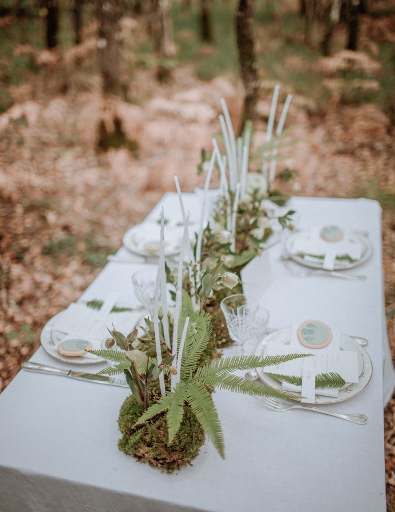 For the table, I chose to create a minimal and long arrangement inspired by nature, starring moss, ferns and hellebores.