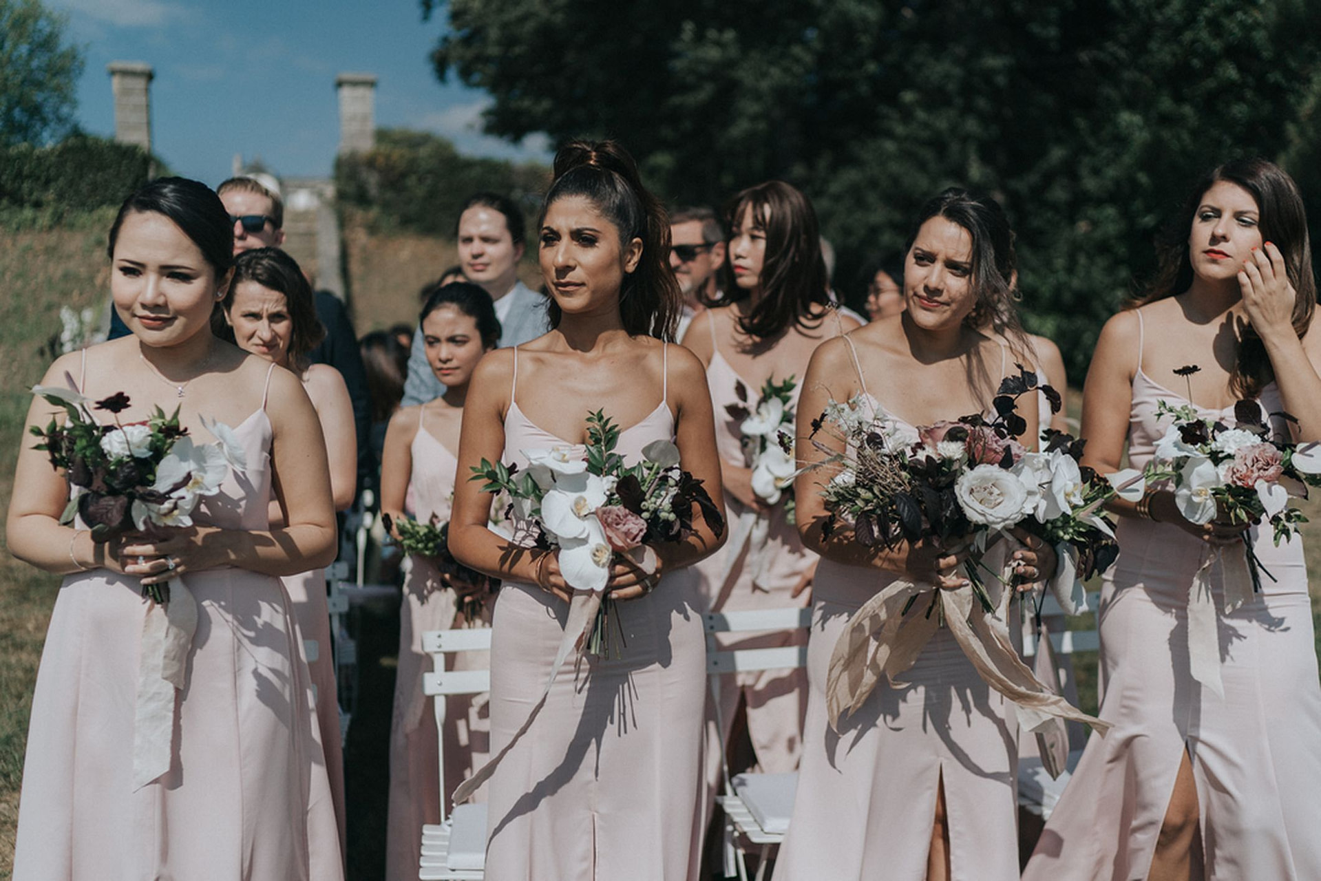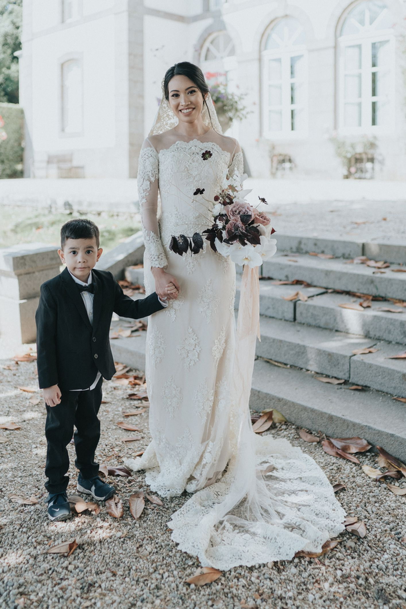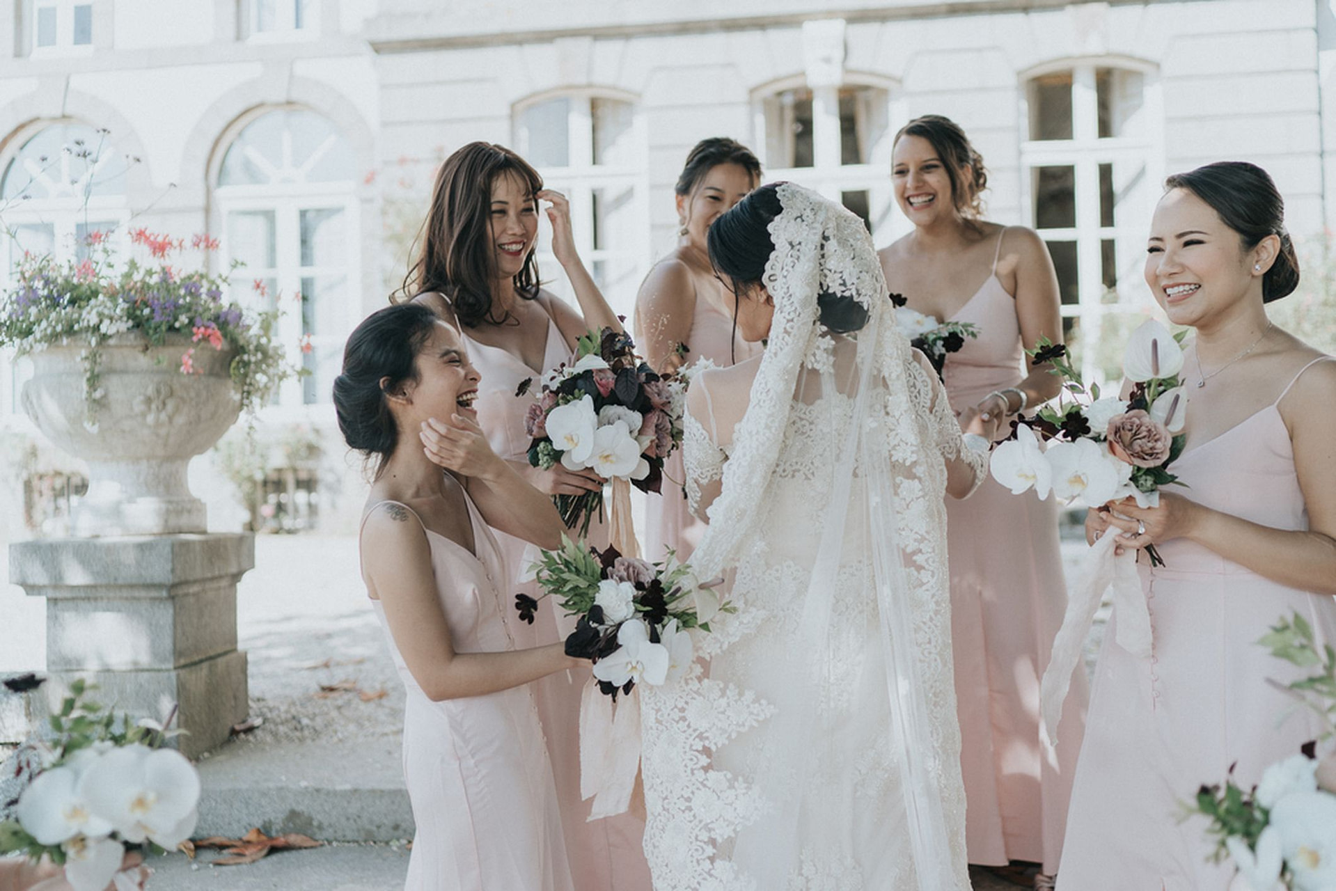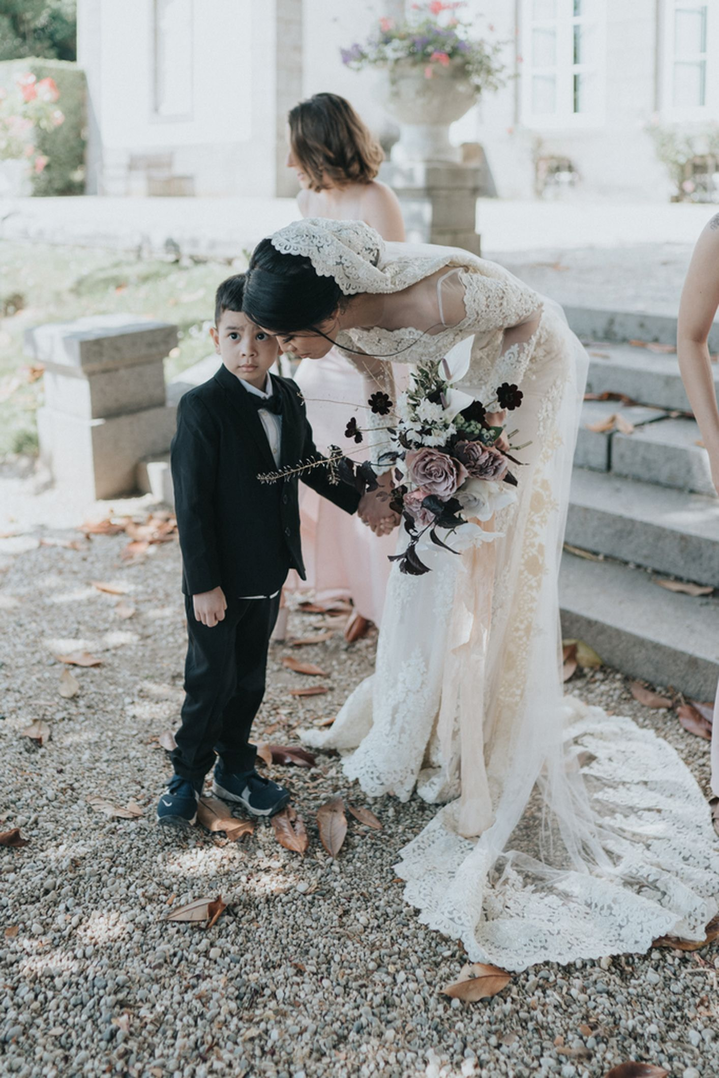 I was really looking forward to Marsha and Alexis’ wedding this season because their choice of colors and flowers has been really inspiring for me. An elegant and modern color palette mixing blush and dark tones, and bold flowers: phalaenopsis orchids, roses, anthuriums… The venue, Domaine du Montmarin, was really beautiful and unique and the ceremony took place right next to water. And what about this bride, isn’t she beautiful?!
