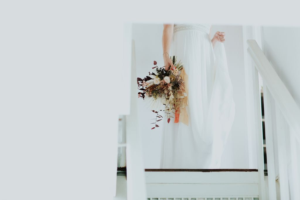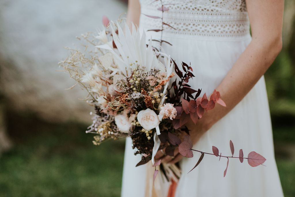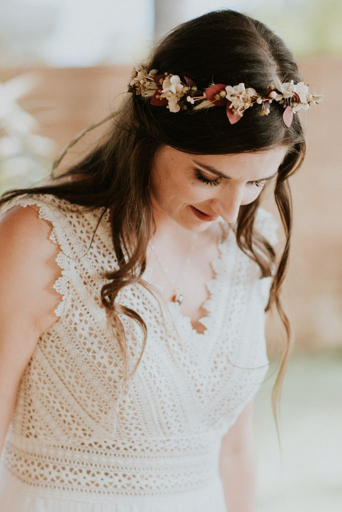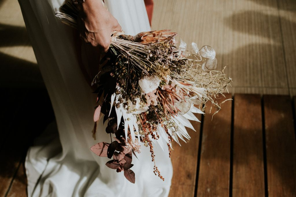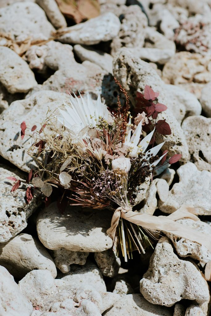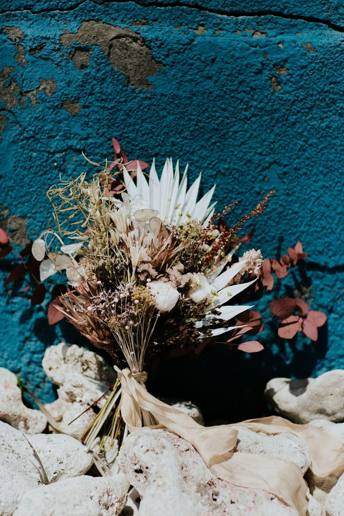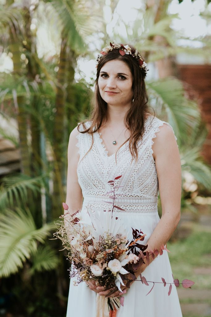 Melanie wanted a 100% dried and preserved Flowers decor so that she would keep memories after the wedding. Her bouquet, flowercrown and all the flowers displayed on the table travelled all the way from France to Reunion island, and they can be kept for years.