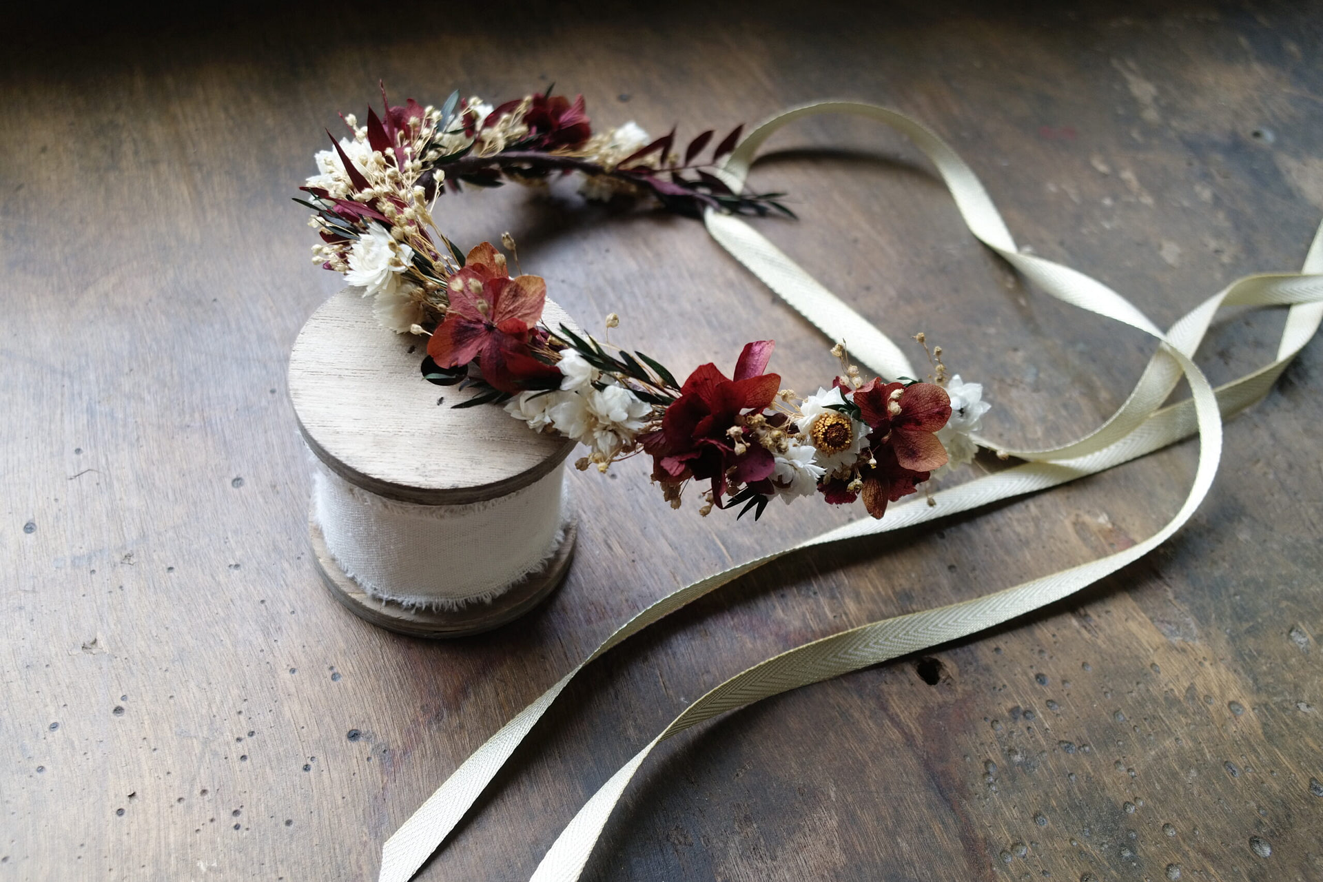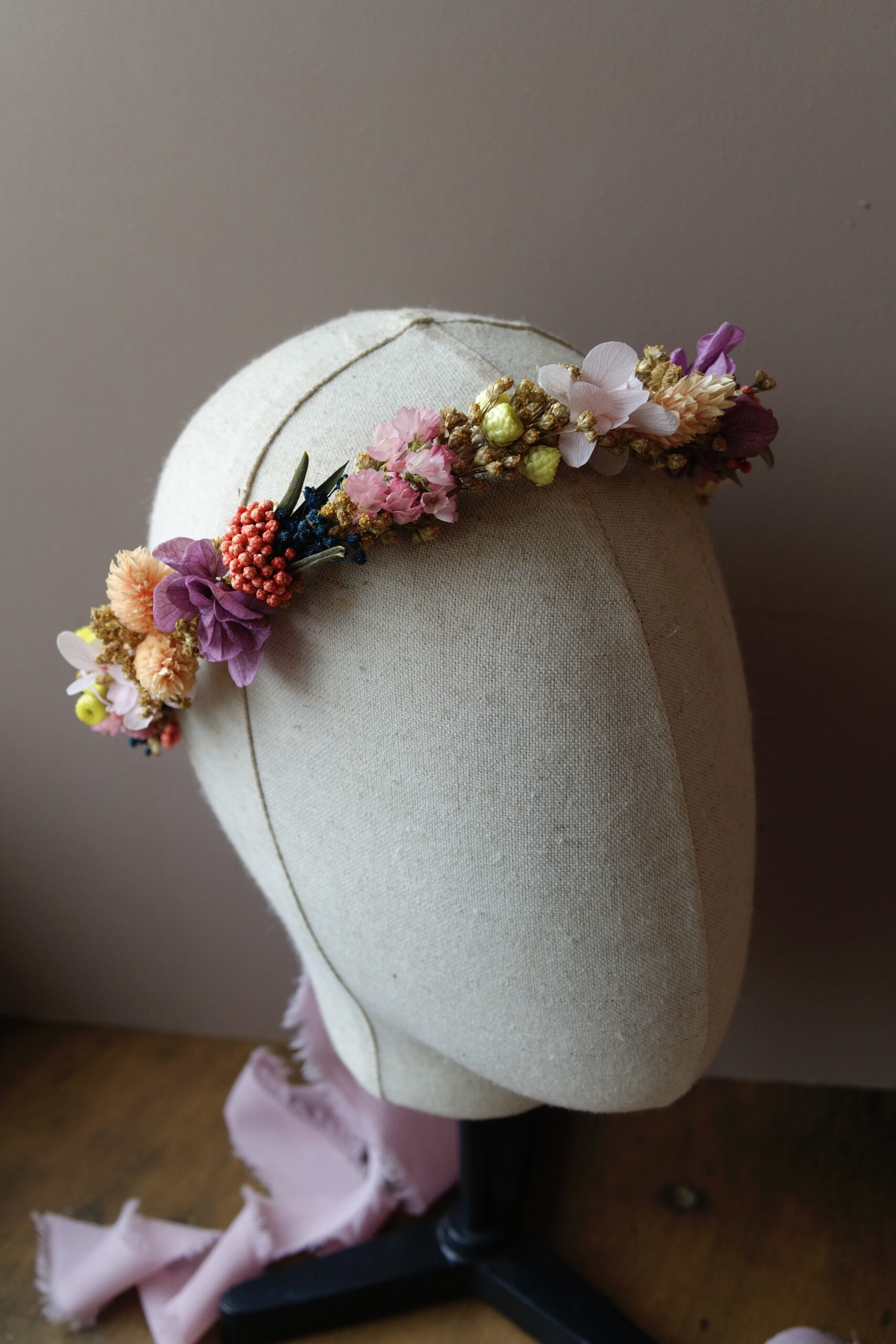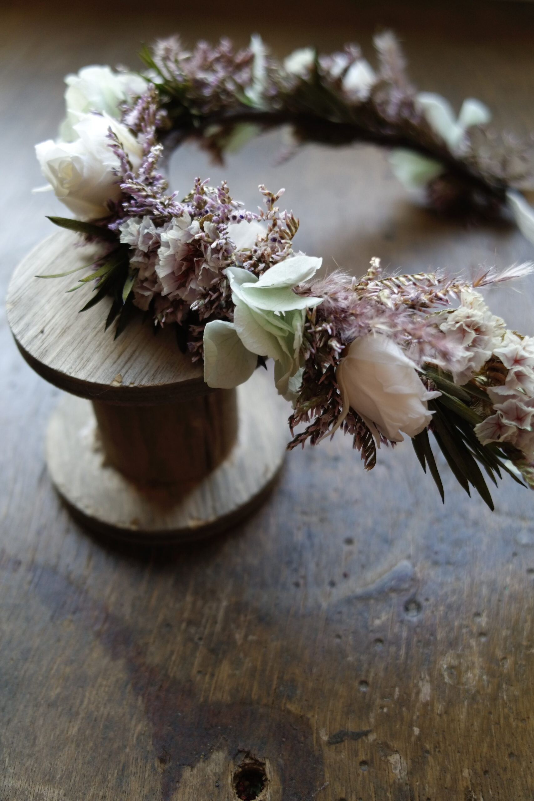 Une couronne en fleurs séchées élégante, travaillée dans un esprit naturel et raffiné. Fine ou plus volumineuse, à vous de choisir le style qui vous inspire!