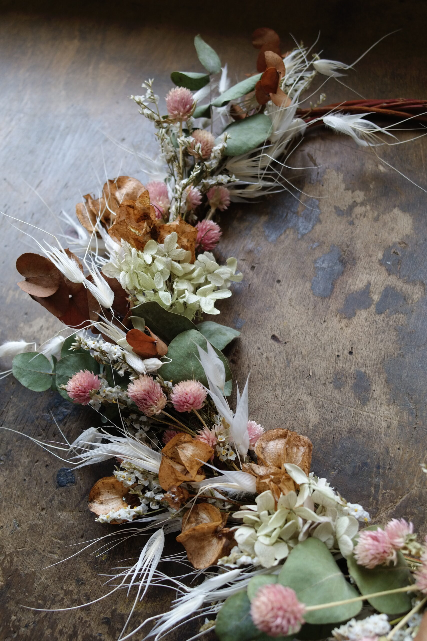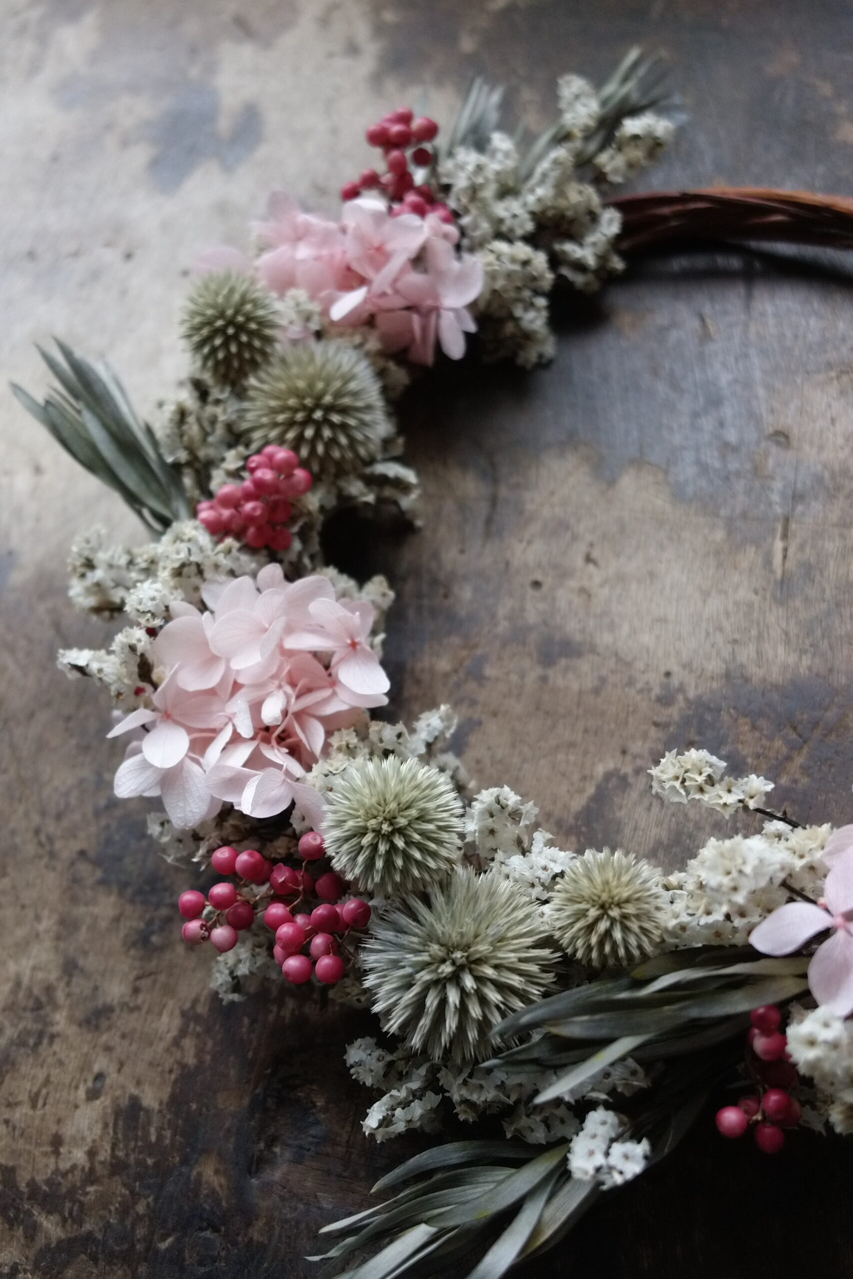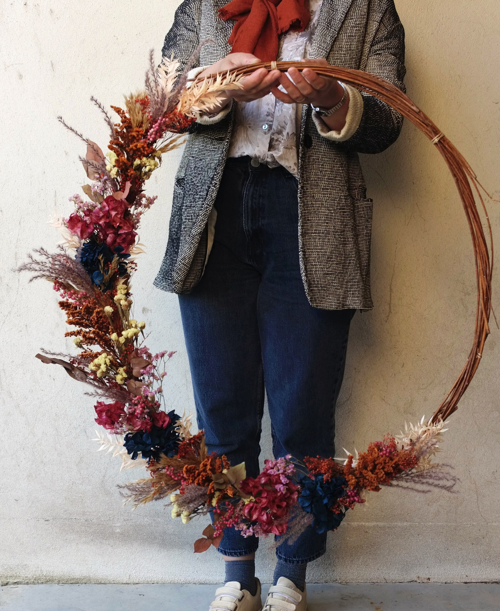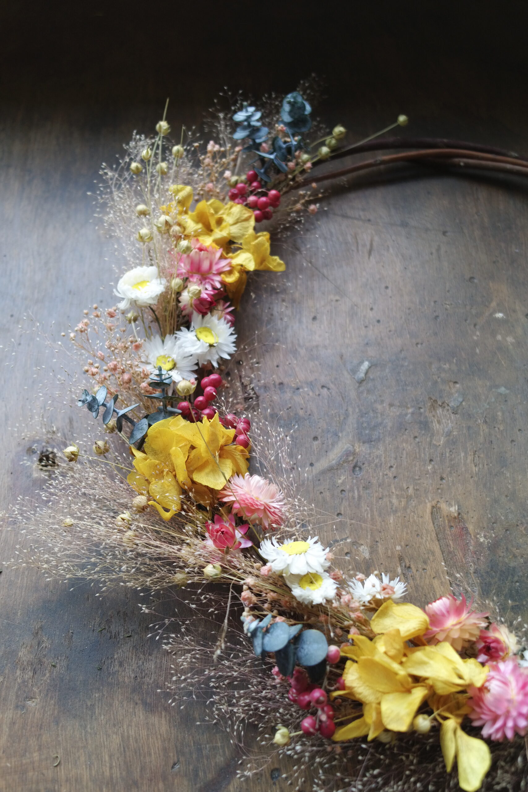 Montée sur une base en bois tressée à la main, cette couronne en fleurs séchées offre un rendu organique et chaleureux.