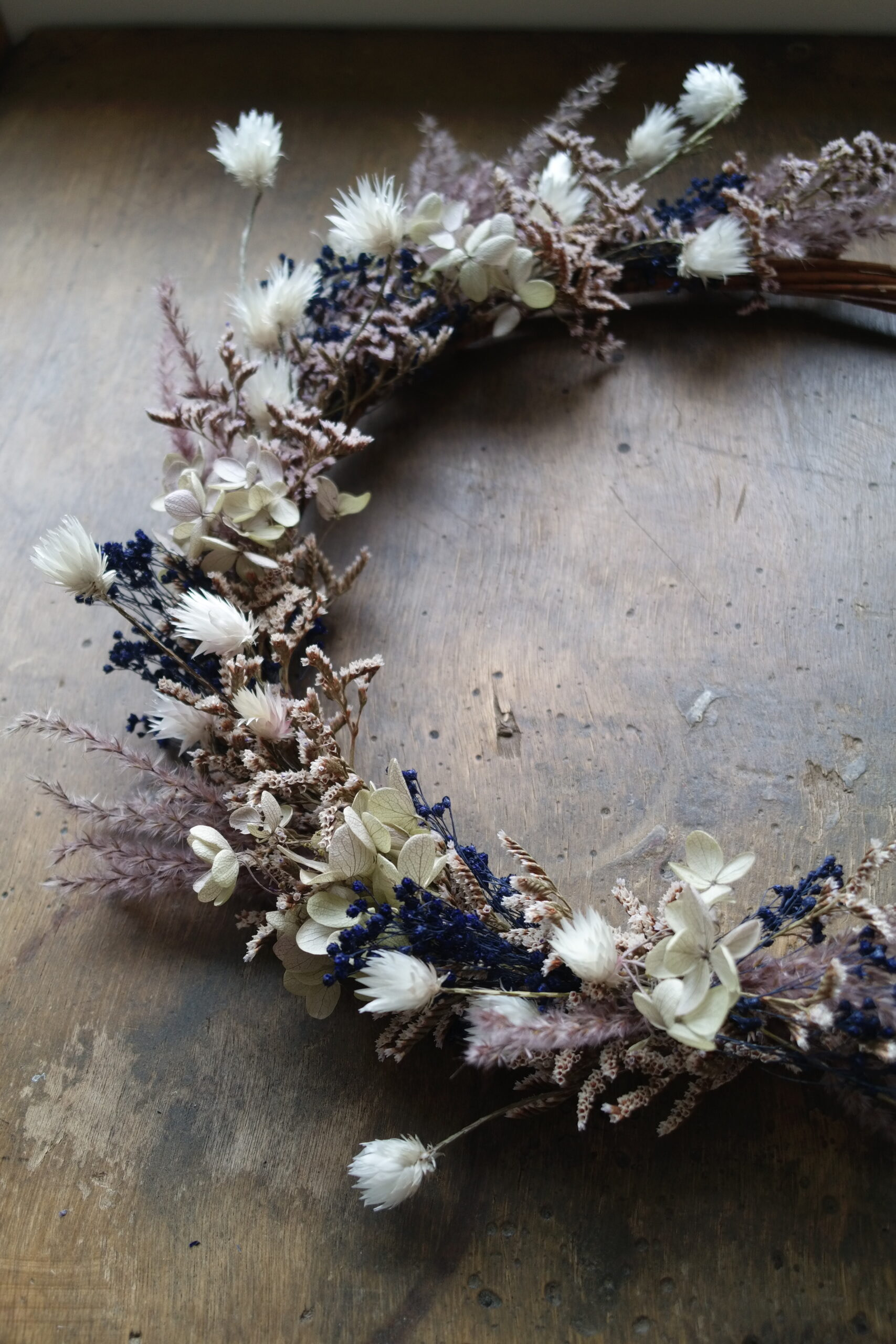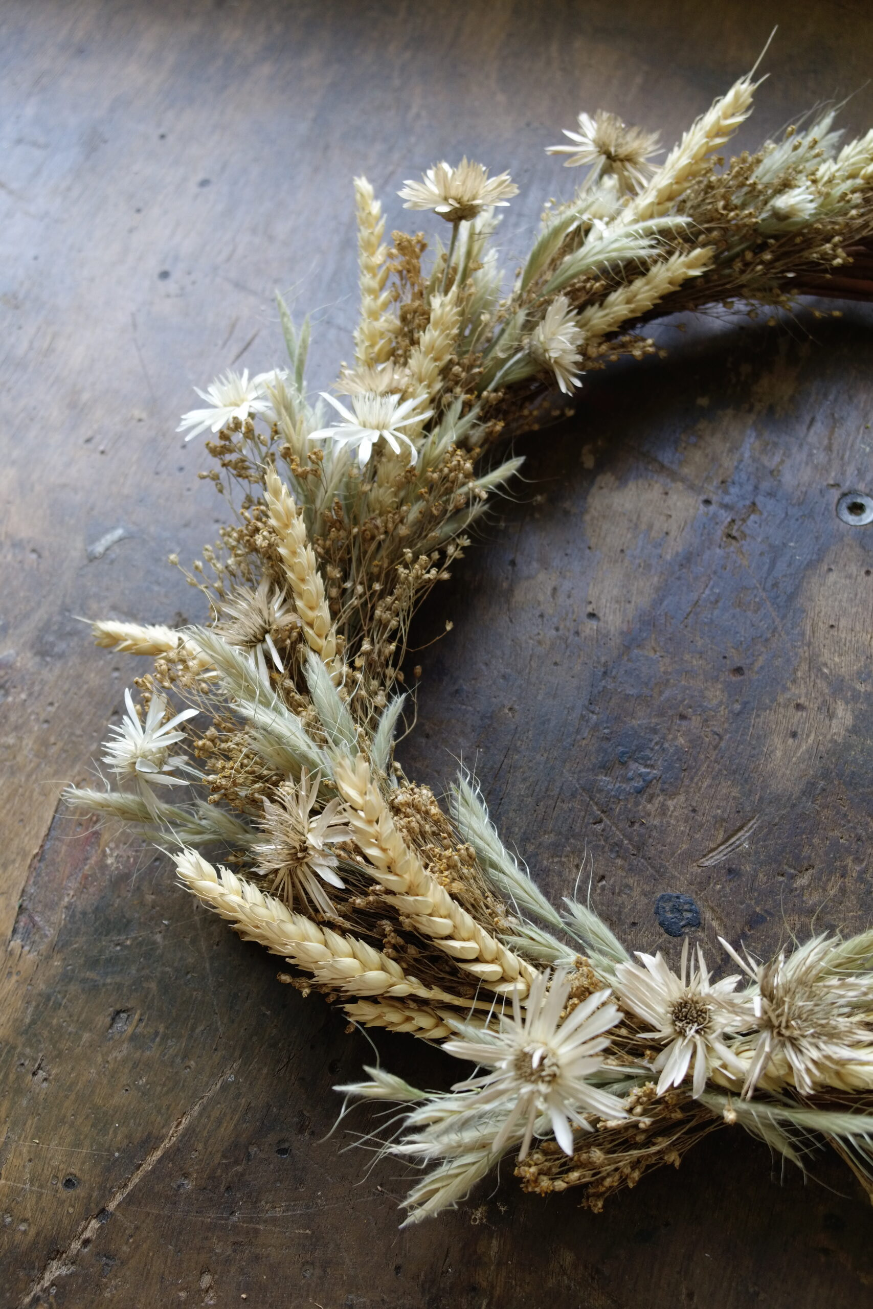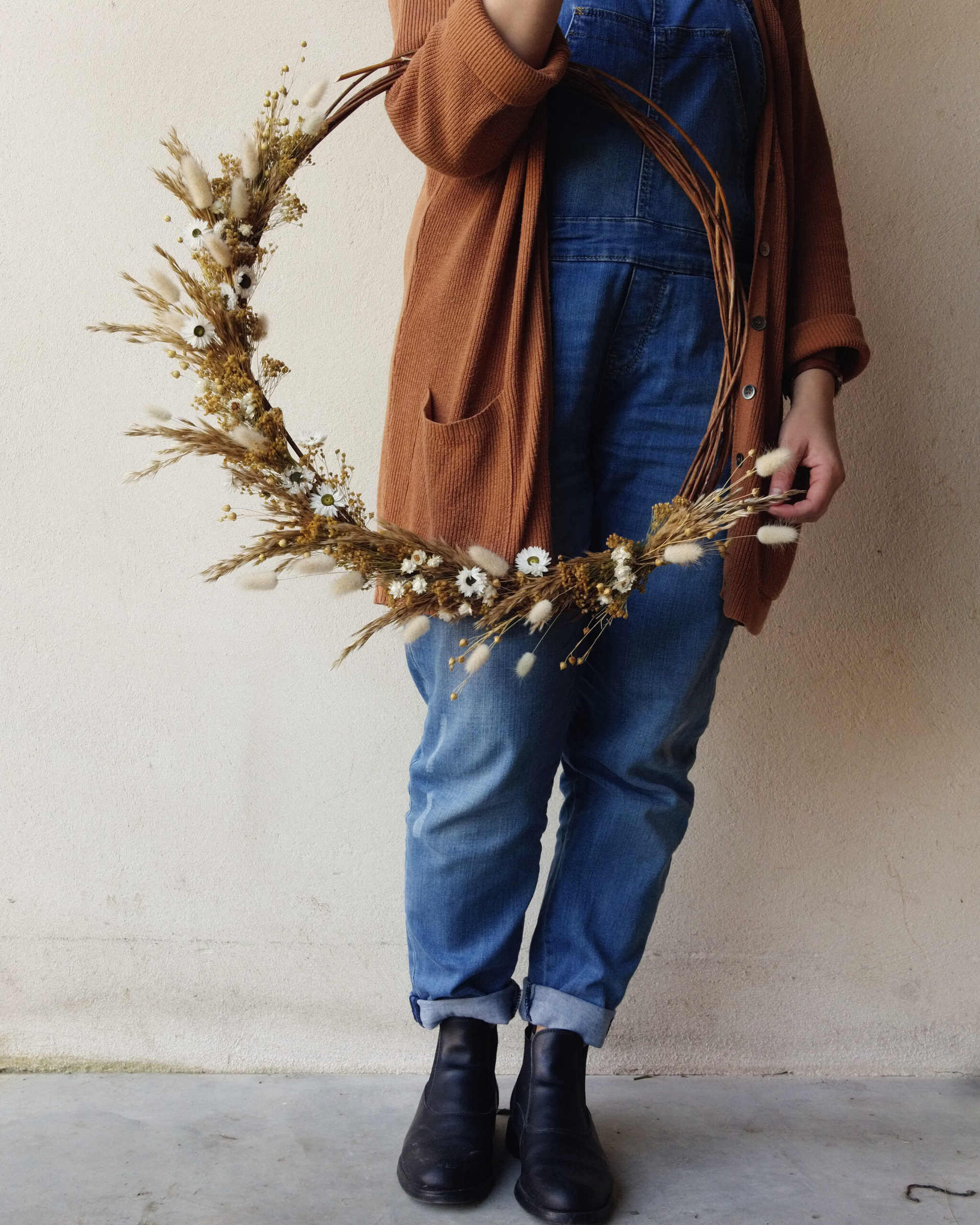 Montée sur une base en bois tressée à la main, cette couronne en fleurs séchées offre un rendu organique et chaleureux.