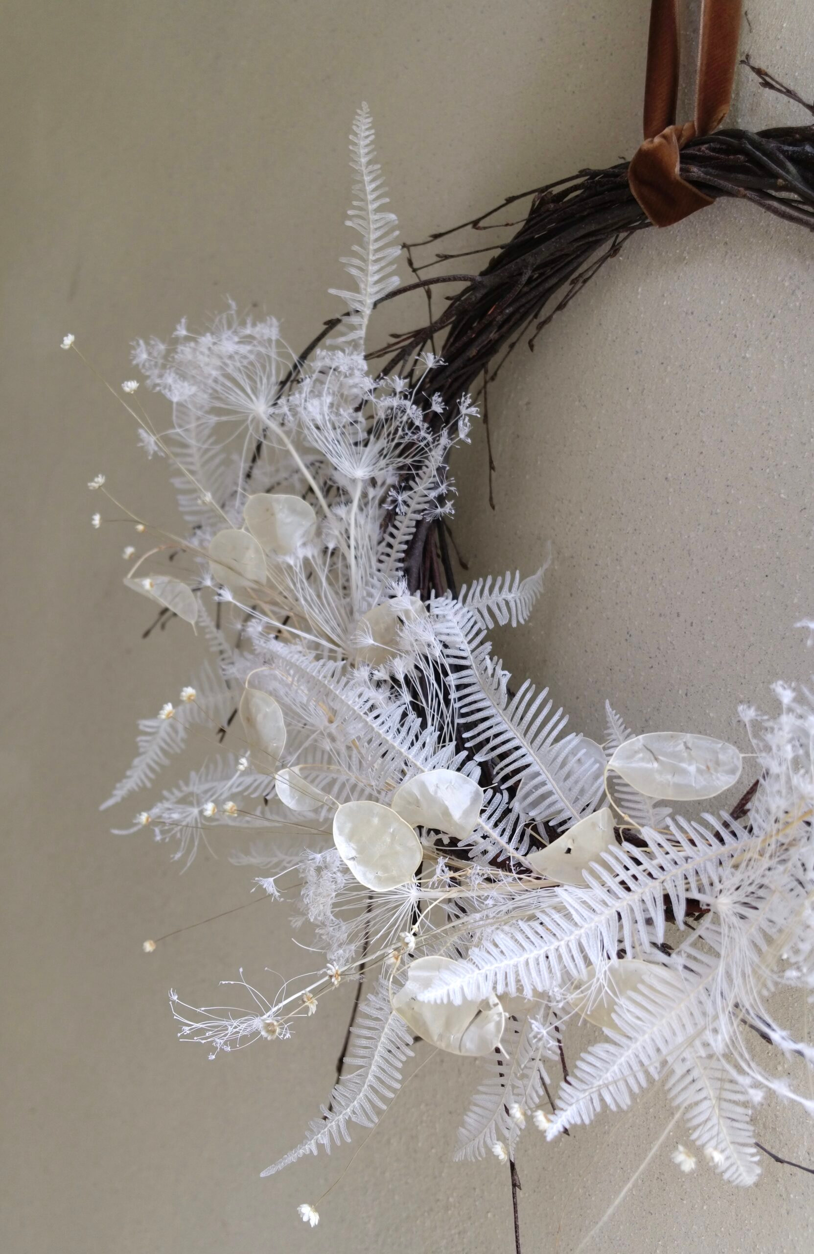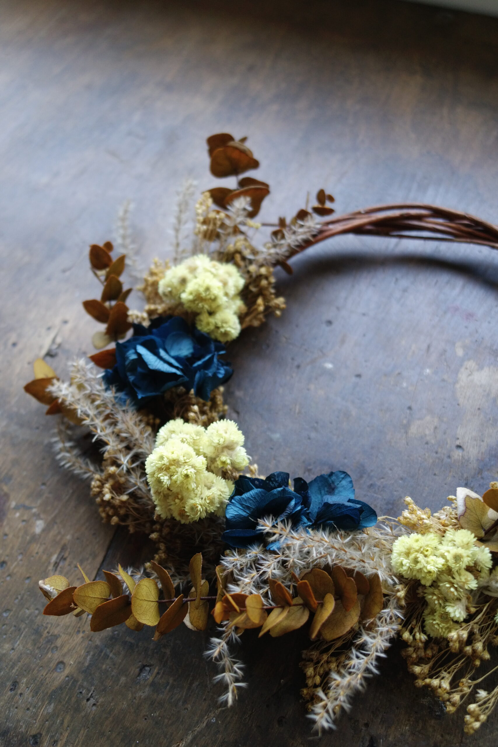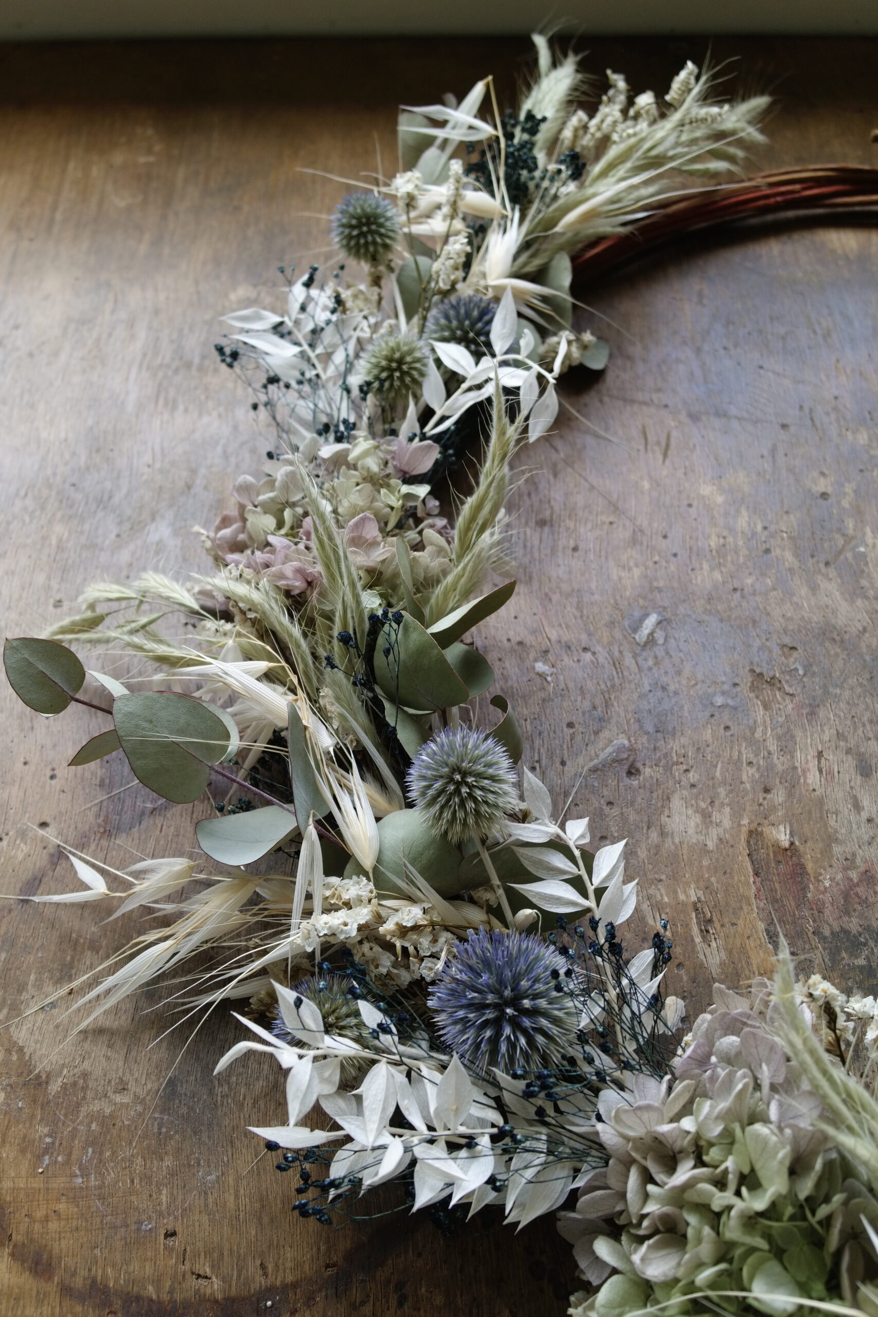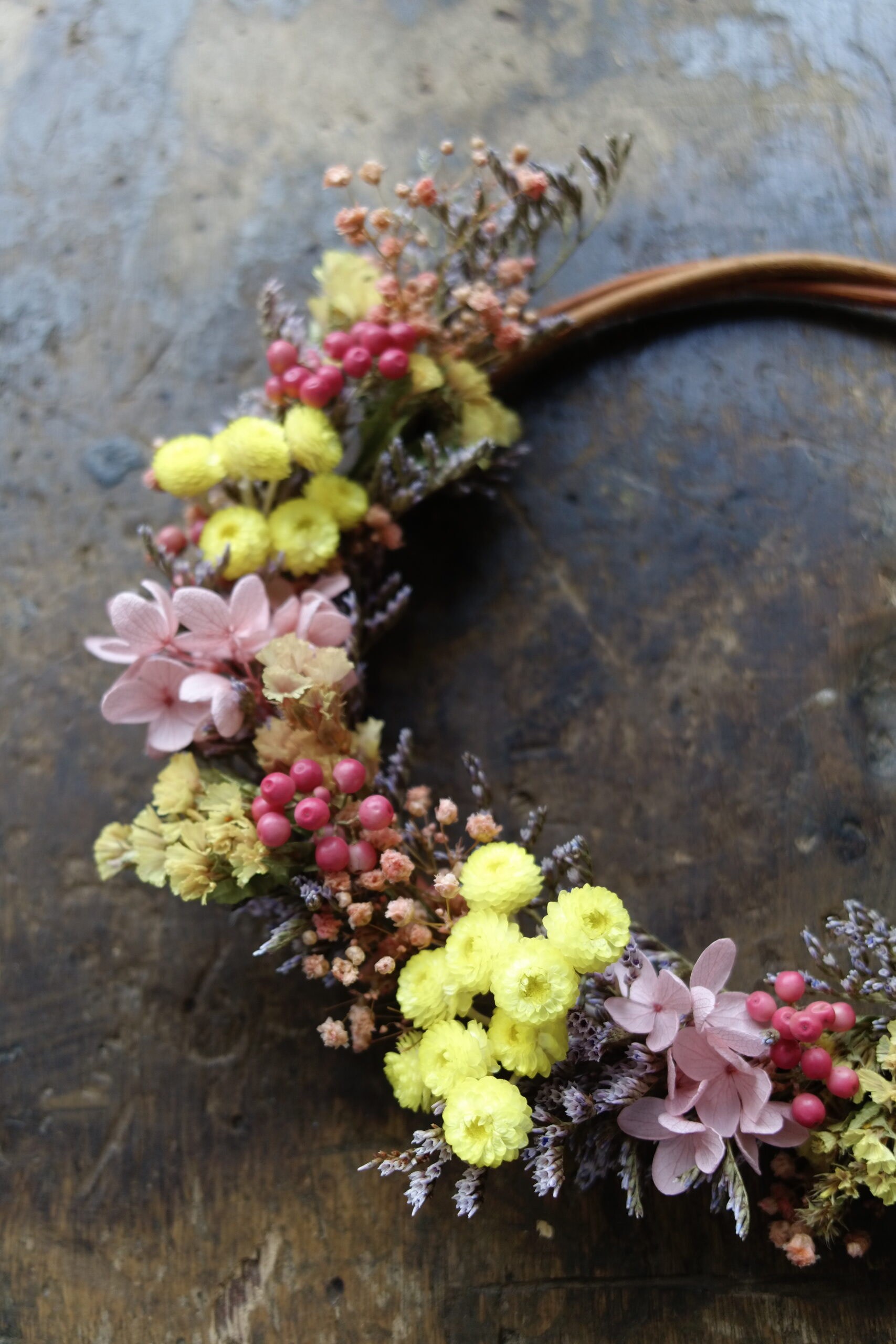 Montée sur une base en bois tressée à la main, cette couronne en fleurs séchées offre un rendu organique et chaleureux.
