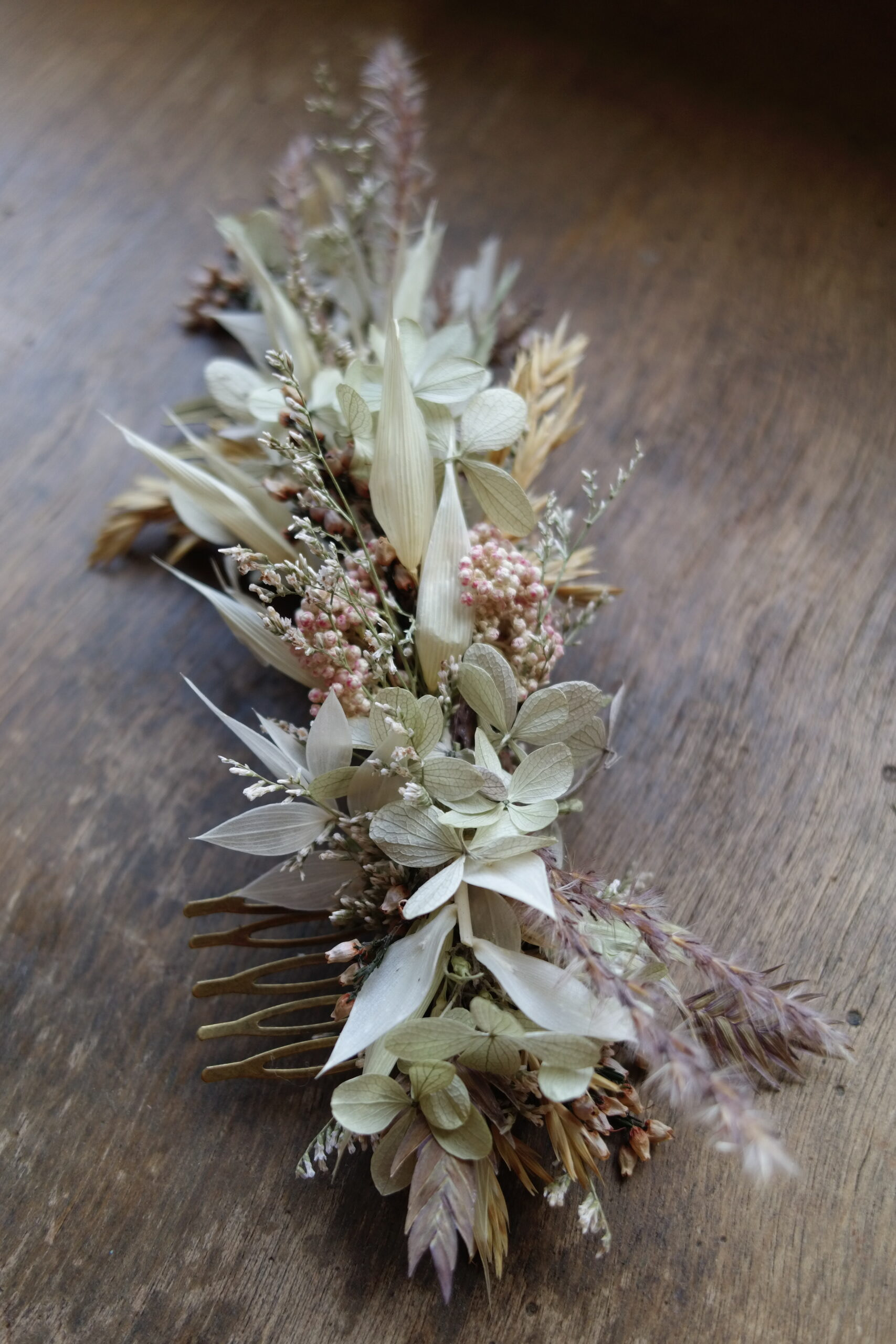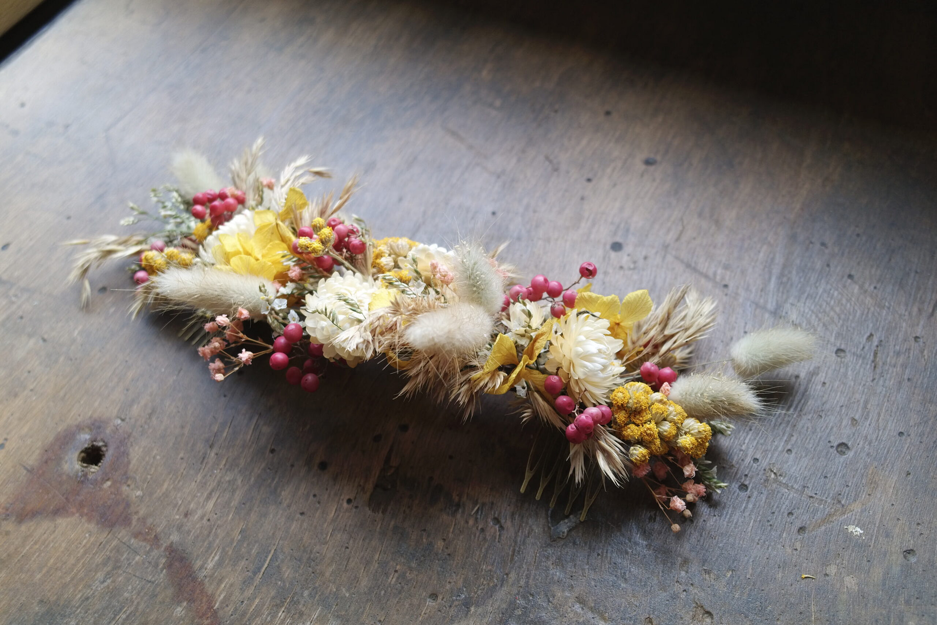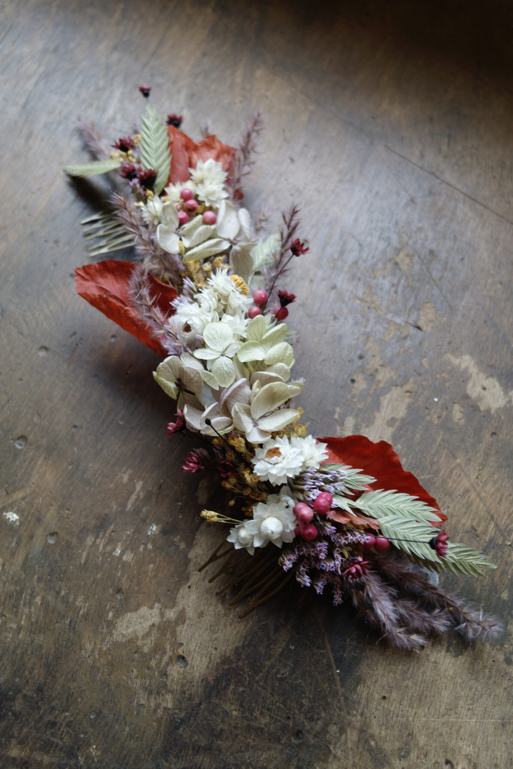 Le double peigne en fleurs séchées structure la coiffure avec élégance et apporte un effet enveloppant.