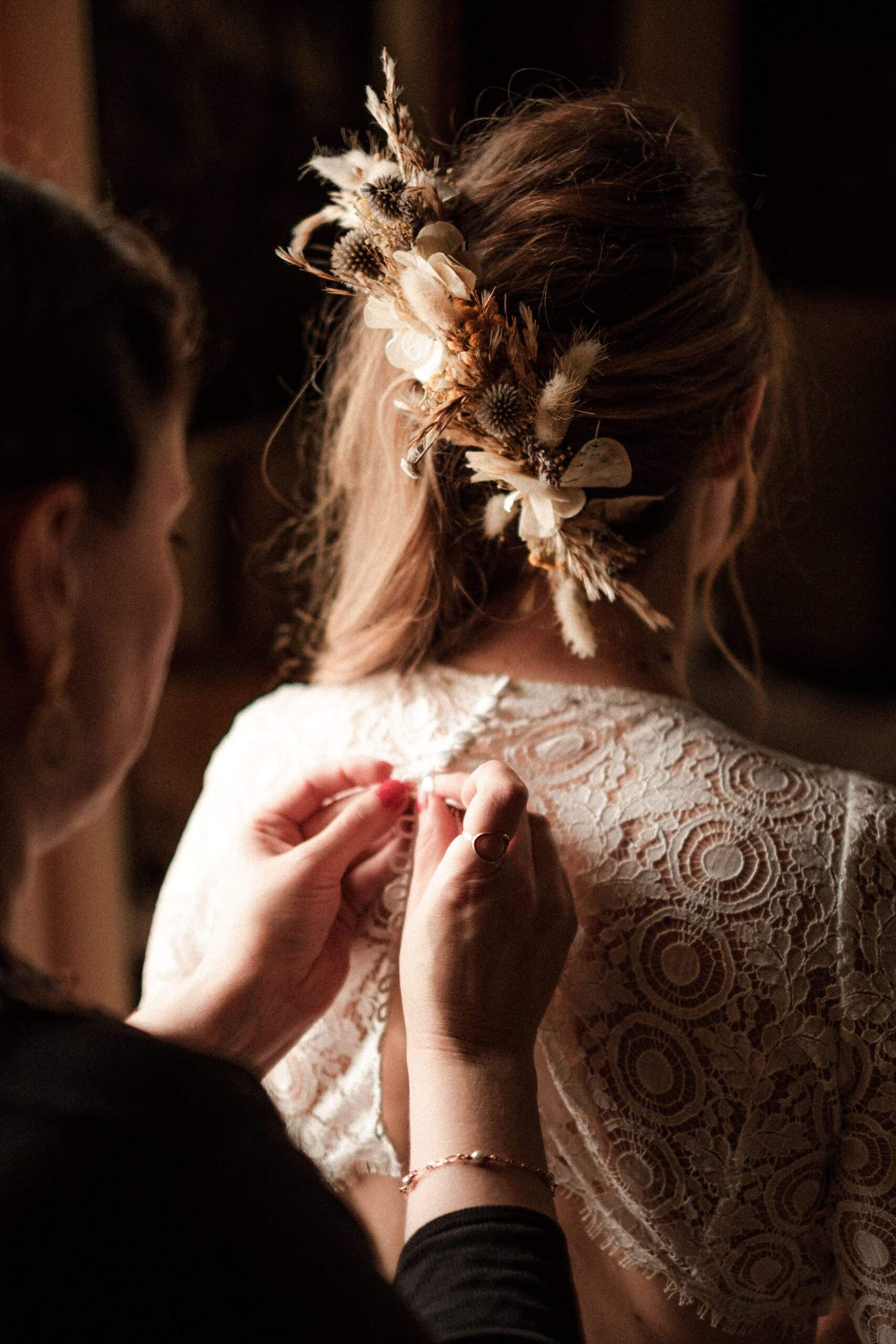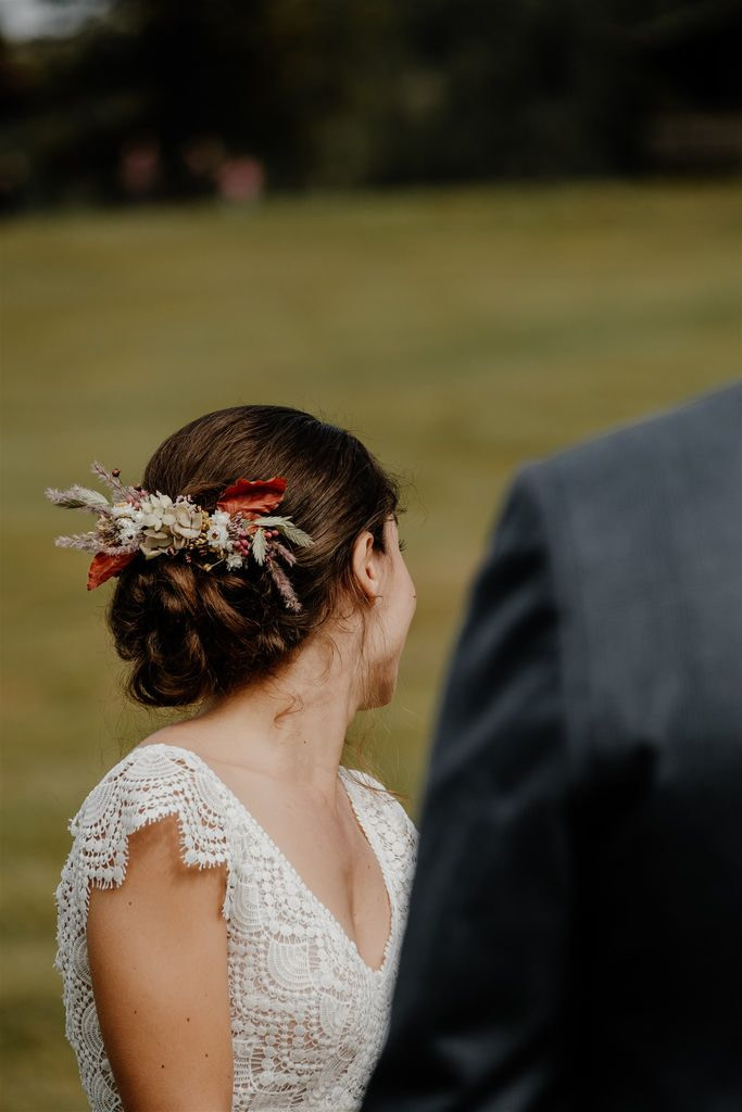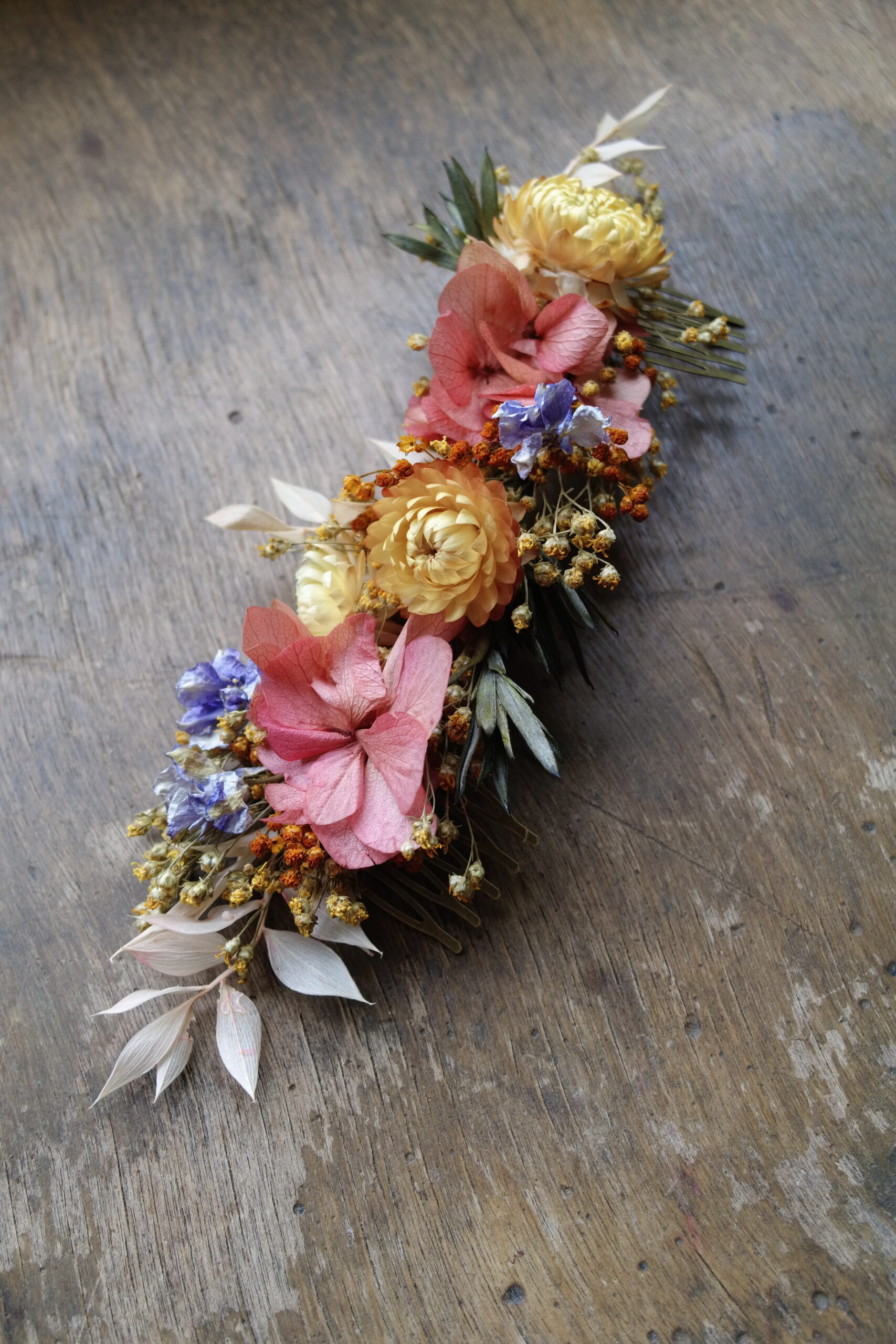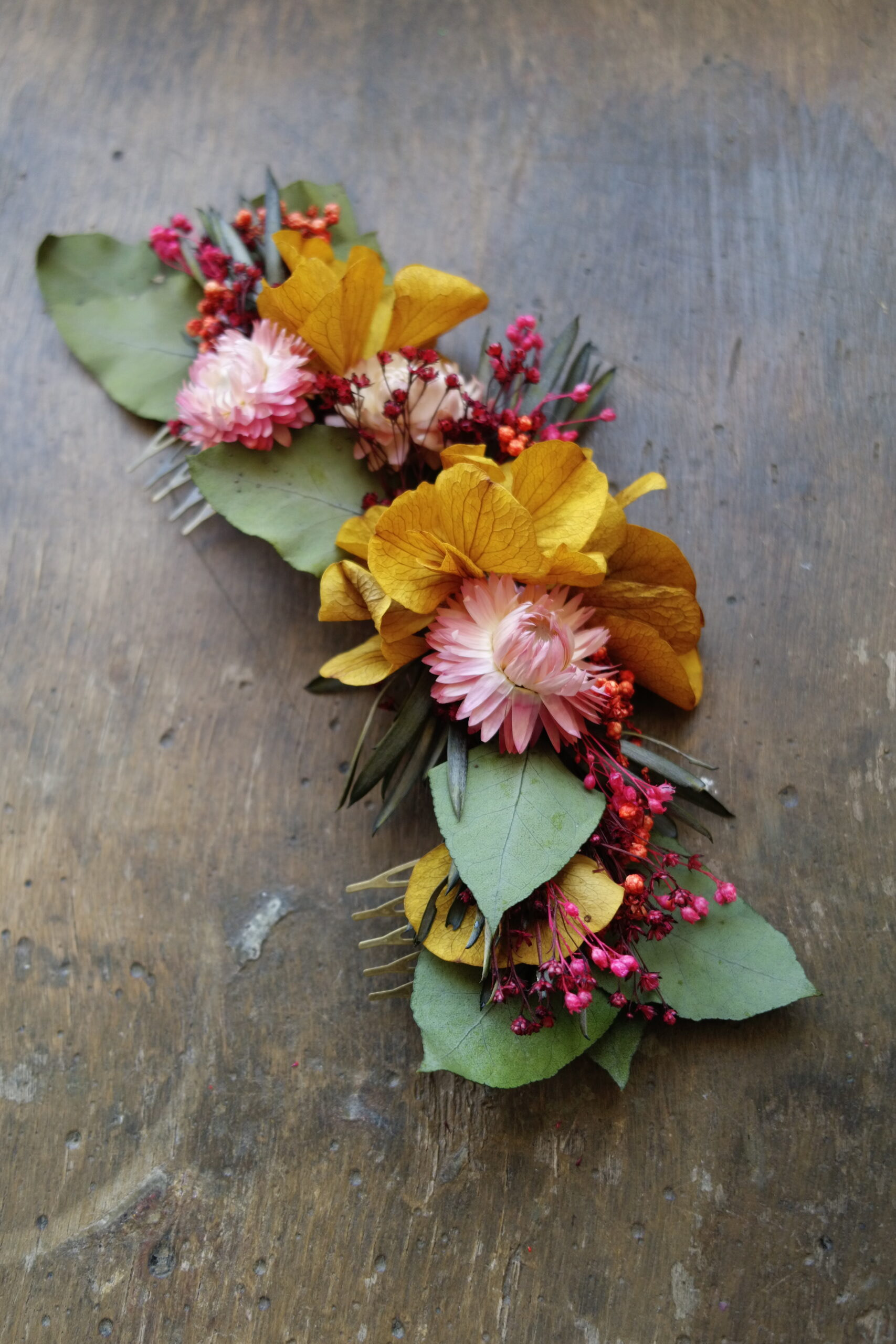 Le double peigne en fleurs séchées structure la coiffure avec élégance et apporte un effet enveloppant.