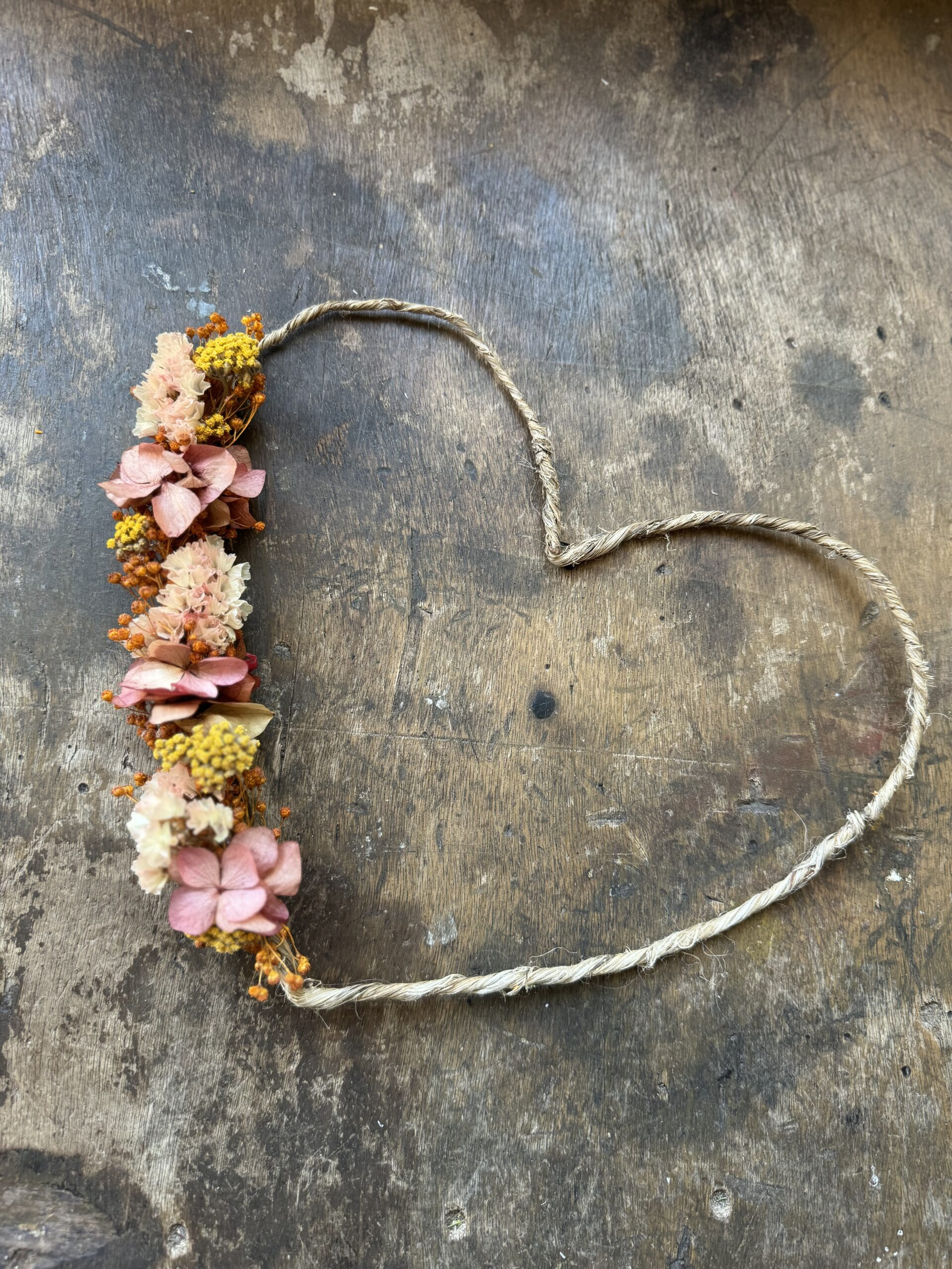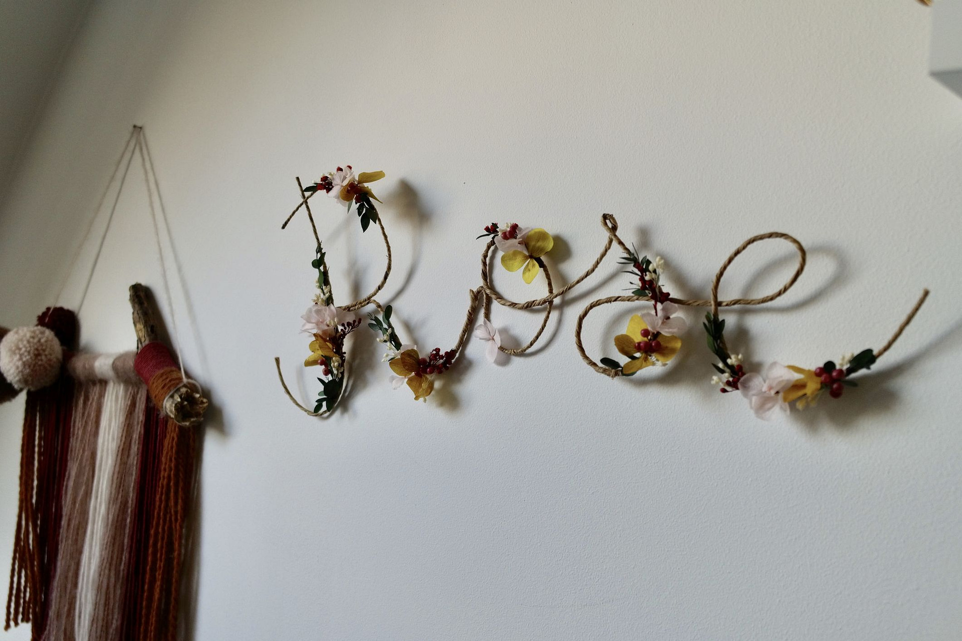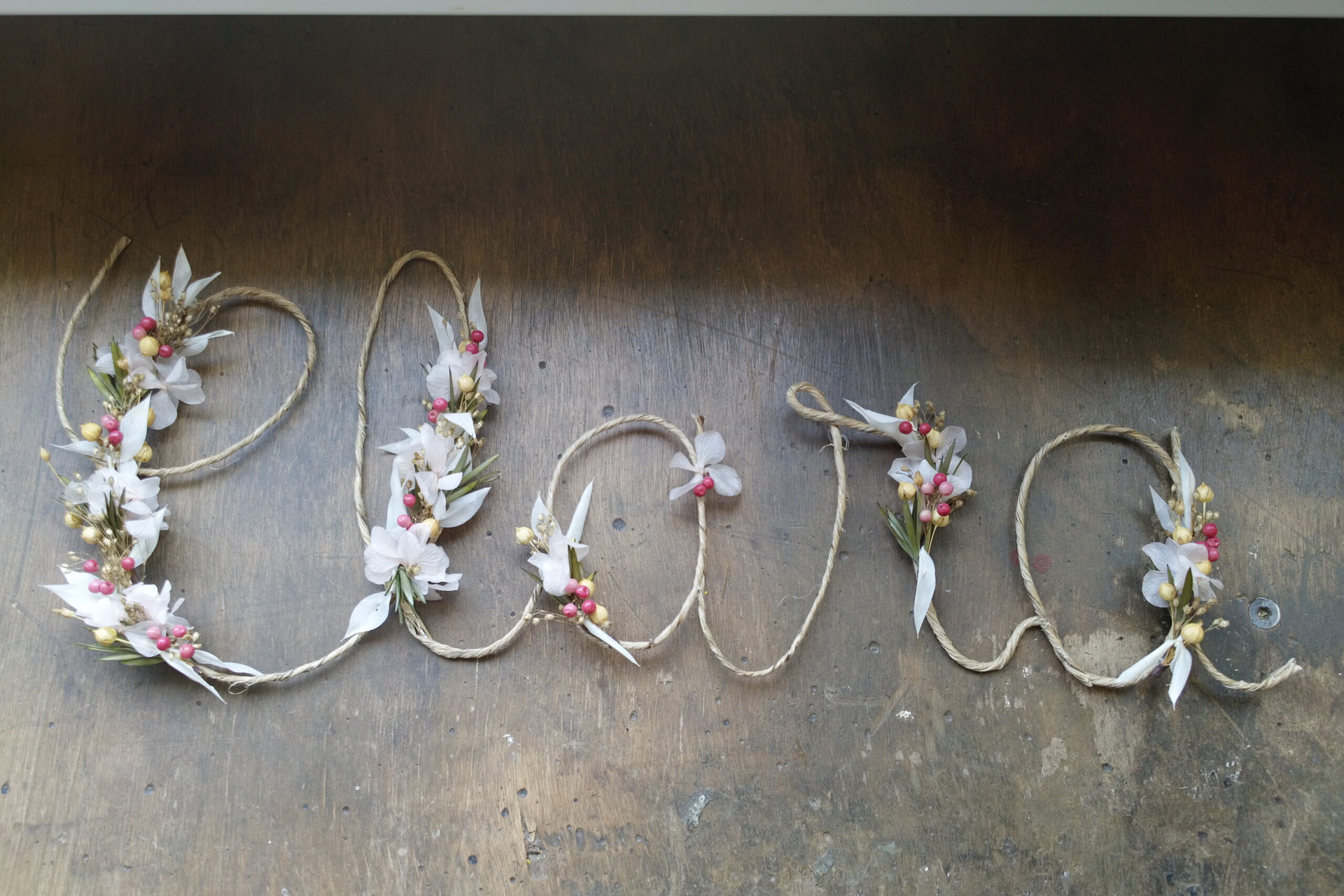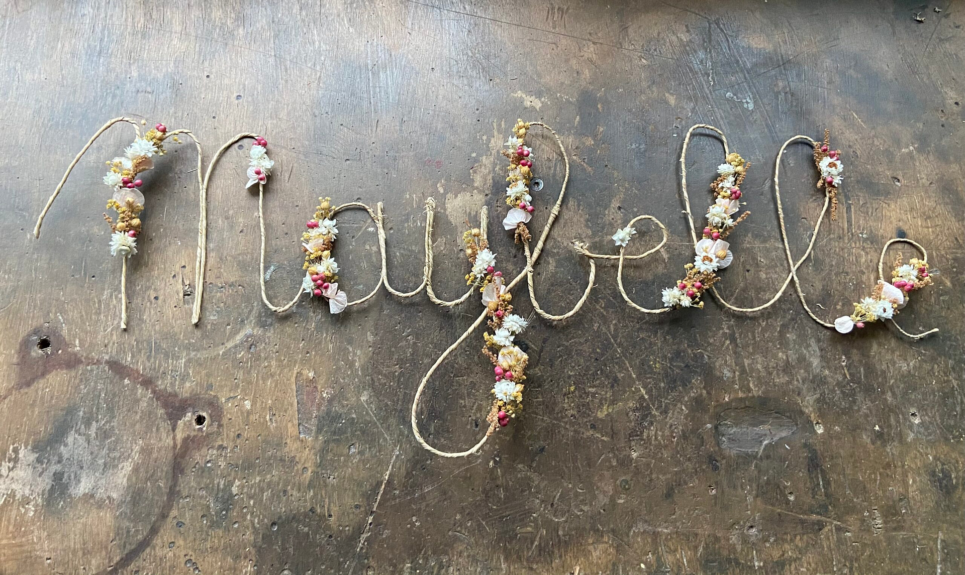 Lettres, mots fleuris personnalisés et coeur en fleurs séchées