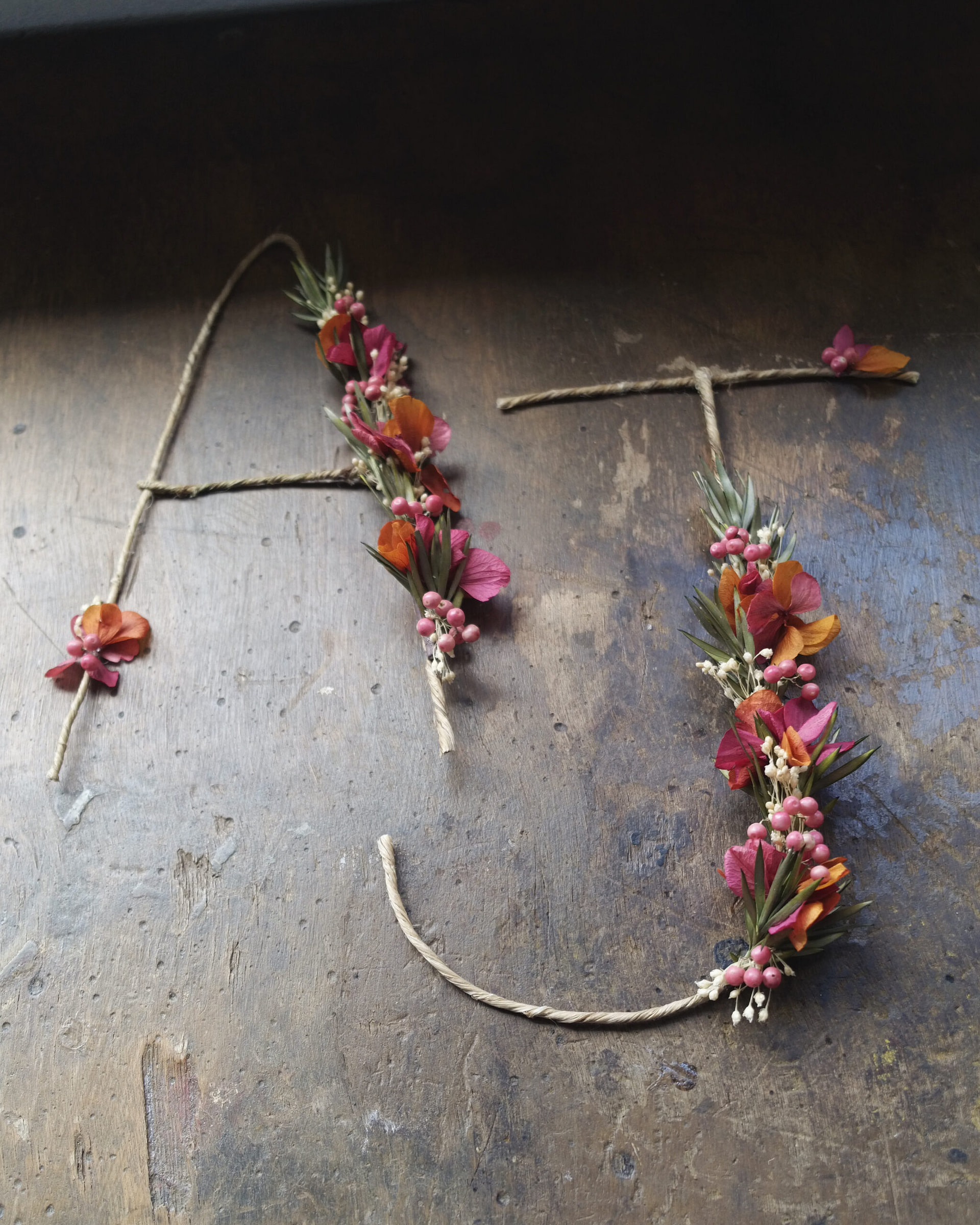 Personnalisez votre décoration avec une lettre, un mot ou une forme personnalisée en fleurs séchées.