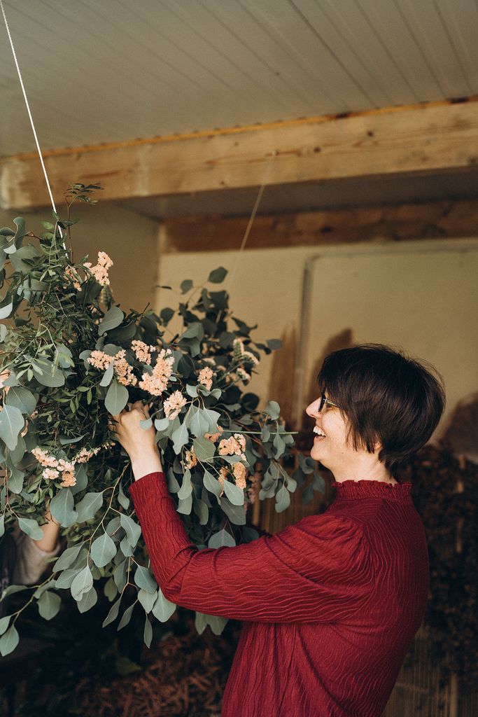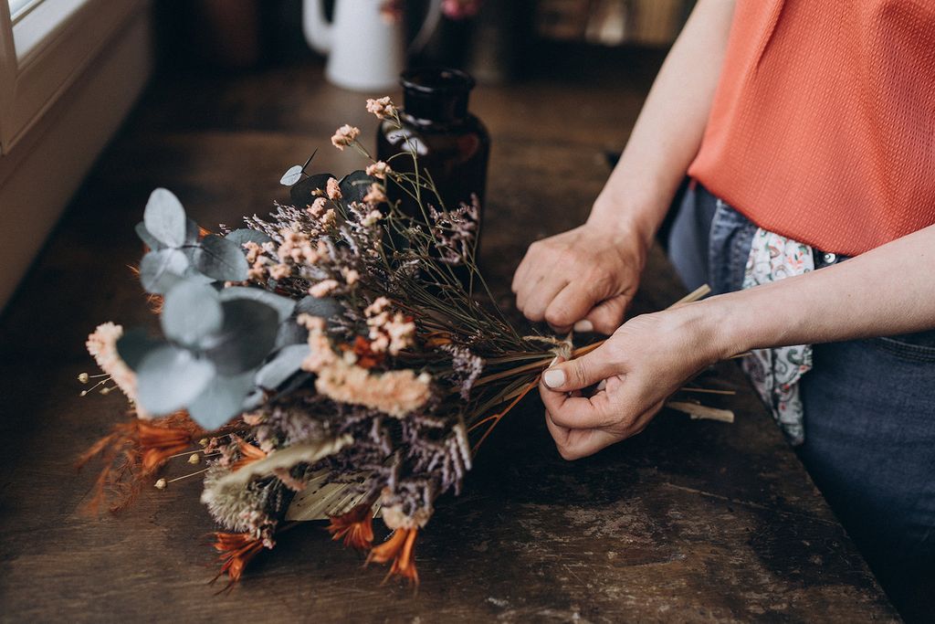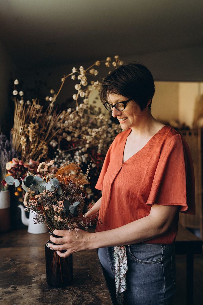 Véronique est fleuriste en boutique depuis de nombreuses années. Formée de façon ‘classique’, elle a souhaité lors de sa formation en one to one bousculer ses habitudes et se confronter à d’autres techniques, plus écoresponsables, pour perfectionner sa pratique.