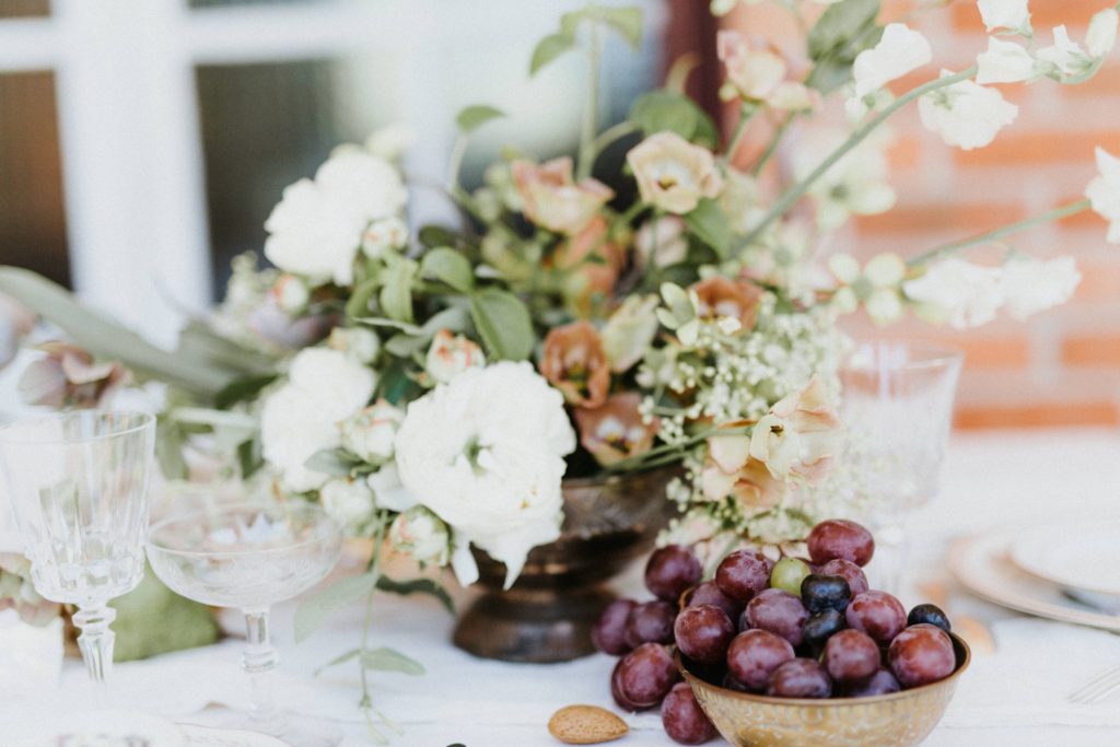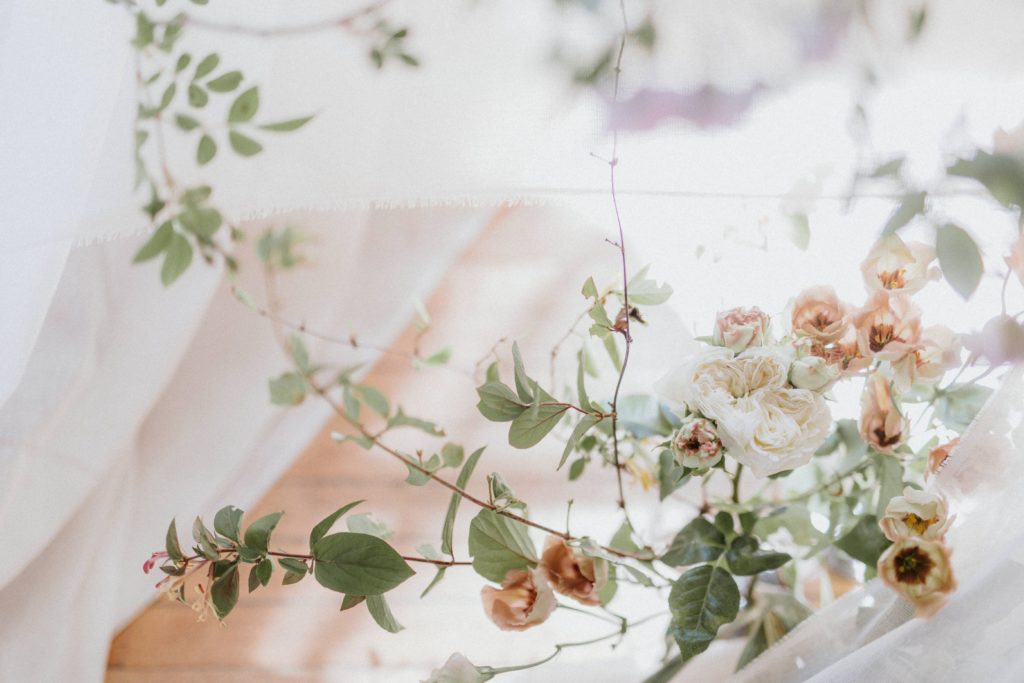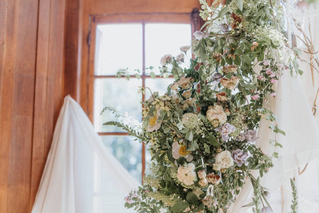 Autour de la banquette en fer forgée chinée par Rosa Event Design, j’ai imaginé un décor floral organique et sauvage aux couleurs douces devant les majestueuses bow windows du Château. Une partie des végétaux utilisés provient d’un producteur local avec lequel je suis allée choisir et cueillir mes fleurs : immenses branchages de rosiers sauvages, hortensias grimpants, chèvrefeuille, cornouiller, hellébores… autant d’éléments qui apportent la naturalité et l’esprit jardin que j’affectionne – sans parler de leur parfum divin! Et comme toutes mes compositions, dans une démarche zéro déchet ce décor a été créé sans mousse florale, avec des structures réutilisables.