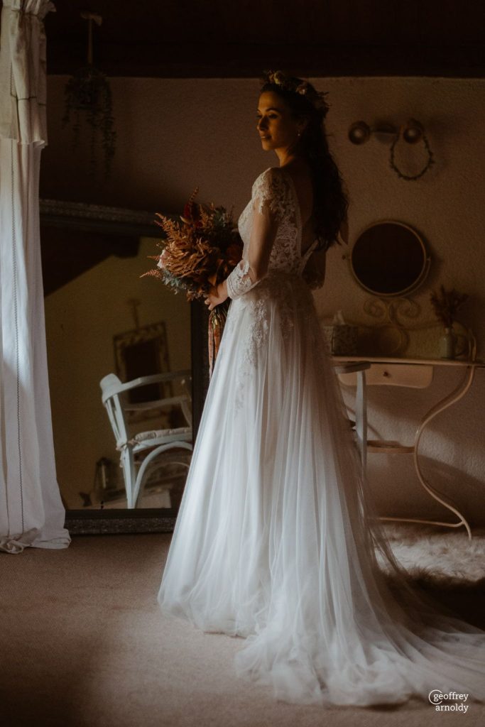 Croyez-le ou non, ce décor devant la cheminée était le plan B, à l’origine la cérémonie devait avoir lieu dehors mais la météo en a décidé autrement. Je suis convaincue que l’ambiance n’en était que plus douce, ce cocon fleuri dans la salle devant la cheminée avec les bougies est un cadre tellement doux pour se dire oui…