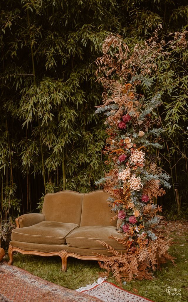 J’ai notamment adoré confectionner ce grand décor de cérémonie tout en textures, mêlant fougère dorée, chrysanthèmes, baies et autres beautés d’automne.